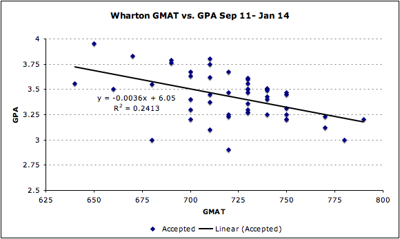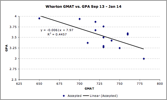 Wharton MBA GMAT vs. GPA Admissions StatisticsThe interesting question is how have recent events shaped Wharton’s admissions decisions. In the graph below you can see that slope of the accepted students has increased from .0036 to .0061, suggesting that this recruiting cycle Wharton has been weighting GMAT more heavily than GPA compared to previous years. The slope is now .0061, which means that 10 GMAT points are considered similarly to .061 GPA points.  An application with an 800 and 3.00 would be viewed similarly to a 700 and 3.61.