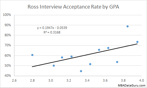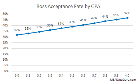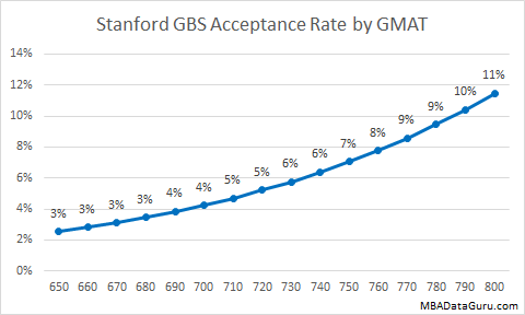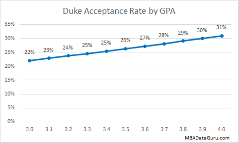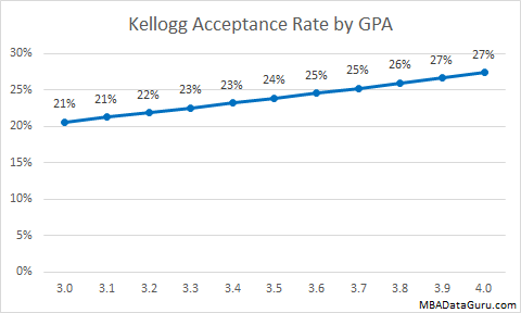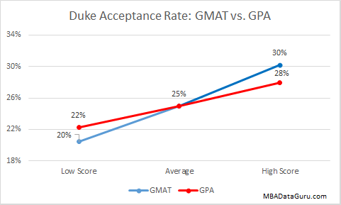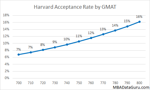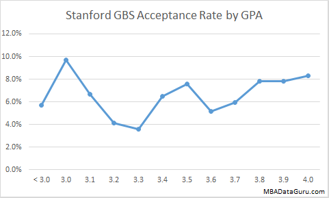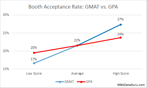 A high GPA will give you a slightly higher acceptance rate at University of Chicago, but it is easy to see that GPA doesn’t have a very large impact on admission rate. Even with a 3.0 GPA the Booth acceptance rate is 18% which is higher than the acceptance rate at Harvard for an applicant with a 4.0.