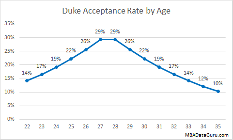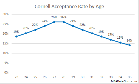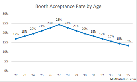 Similar to Duke and Cornell, the Booth admission committee prefers applicants who are around 27. The further a candidate is from the average age, the lower their chance of acceptance is. I believe that this is because candidates with around 5 years of work experience have worked long enough to impress potential employers and contribute to classroom discussion while not being over qualified for on campus recruiting positions.