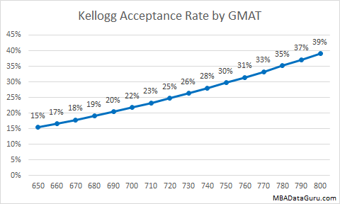 The graph above demonstrates that GMAT has a high impact on Booth admissions. Increasing your GMAT from 650 to 750 more than doubles your chance of admission. The average GMAT score for an applicant is 718, but the admitted applicants have a slightly higher GMAT of 724.