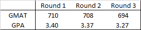 The graph above compares the importance of GMAT vs. GPA to Booth admissions. Candidates with a high GMAT score had a significantly higher acceptance rate than those who had a high GPA.* If you have a high GMAT and a low GPA, University of Chicago is an ideal school at which to apply. For example an applicant with 3.0 GPA and a 760 GMAT has a 25% chance of being admitted.