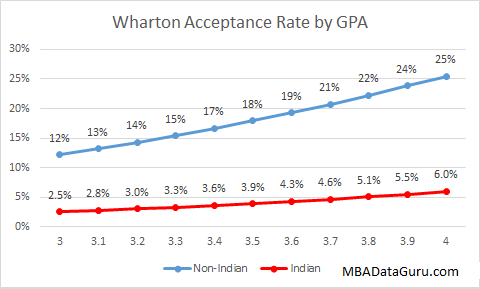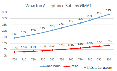 The first thing that jumped out at me was that the acceptance rates I came up with are noticeably higher than the published acceptance rate of 15%. I believe that this is because the average candidate who applies and posts their data on GMAT Club, where I get my data, is more competitive than the average candidate. The average GMAT Club applicant to Stern has a GPA or 3.45 and GMAT of 709, which is not too far from the scores listed on the class profile for Sterns class of 2016 of 3.52 and 721.