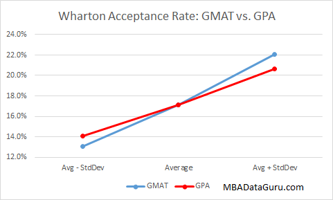 In the graph above, you can see that increasing the GPA by one standard deviation (.28) increase acceptance rate by 29%, but raising the GMAT score by one standard deviation (39) leads to a 45% higher chance of admissions. It is clear that Stern prefers candidates with high GMAT score over ones with a high GPA. This is good news for candidates with a low GPA because with enough hard work, you can increase your odds significantly by raising your GMAT.