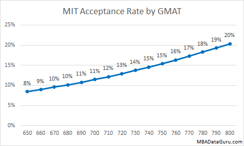 The average GMAT score for Kellogg’s 2 year MBA program is 717, however the average GMAT for applicants is lower, coming in at 709. The graph above shows the relationship between GMAT and Kellogg acceptance rate for the average applicant, who has a GPA of 3.38. You can see there is a strong relationship between GMAT and Kellogg acceptance rate. An applicant to Northwestern has twice the chance of getting in with a 750 compared to a 650.