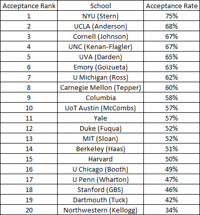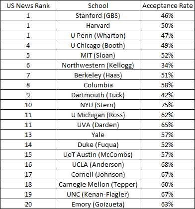 The average acceptance rate for top 20 schools is 23%. Many of the concentrations towards the top are fairly small with the exception of Marketing. As you can see, there is a huge range in the acceptance rates based on industry focus. With Social Entrepreneurship applicants 2.5 times more likely to be admitted than applicants interested in Technology or Operations. Most of the results don’t surprise me, business schools seem to be trying to help the world right now, so it is no shock that Social Entrepreneurship, Nonprofit and Sustainability are all in the top half. With the crisis in the Healthcare industry, the high acceptance rate for Healthcare applicants is also logical I am a little surprised that Real Estate is so high and Technology is so low. There is not a lot of focus on Real Estate that I have seen in business school, so I didn’t expect it to be the concentration with the second highest acceptance rate. On the other hand, Technology is very hot right now, so it is shocking the admissions rate is so low.