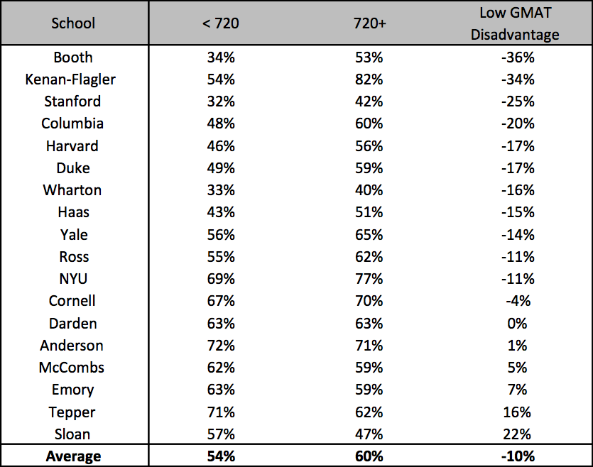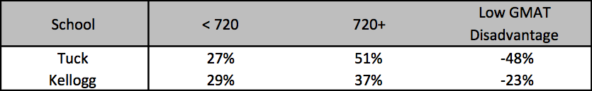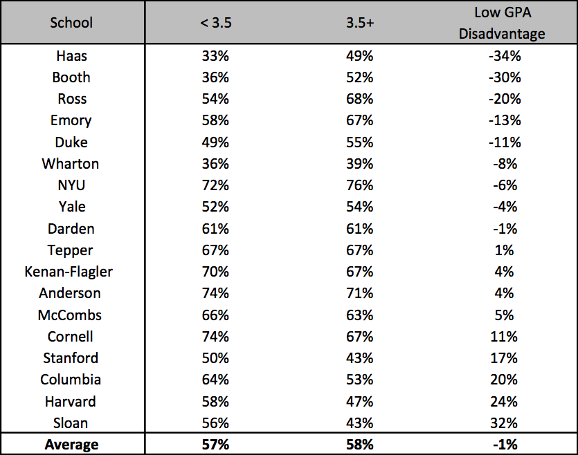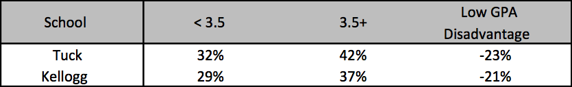 Despite having the highest average GMAT and GPA, applicants who apply to 8 schools have an acceptance rate of only 13%. This supports the idea that if you apply to many schools then you don’t have as much time to commit to each application, so quality decreases. Those who apply to 9 or 10+ schools tend to have lower GPAs while those who apply to 1 school tend to have lower GMATs. People who apply to 6 to 8 schools on average have the highest combined scores.