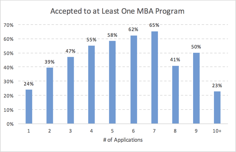 In conclusion, there are many considerations when deciding how many MBA applications to submit. Most of the data suggests that an applicant should apply to 5 to 7 schools to maximize their chance of getting into at least one school. If you want to raise your chance of being accepted to at least one MBA program above the 65% figure for 7 applications, I recommend you hire a consultant to help you craft your essays and avoid major mistakes rather than just submitting more applications.