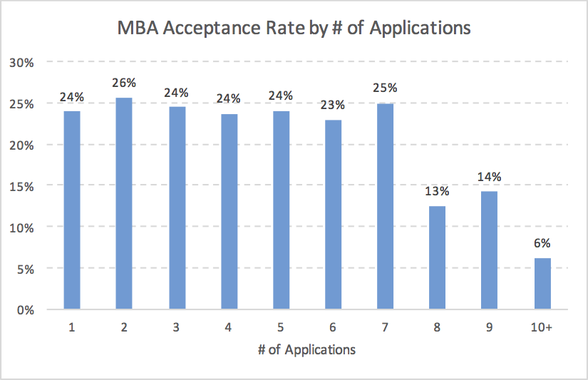 This graph is possibly the most important piece of information for applicants who are considering applying to a lot of schools. It shows that average acceptance rate per application is relatively flat if you apply to seven or fewer MBA programs, at around 24%. However, if you apply to more than seven schools then acceptance rate plummets to lower than 15%. Those few individuals who apply to 10 or more schools only have a meager 6% acceptance rate. Perhaps there are alternative explanation as to why these acceptance rates drop so much, such as GMAT or GPA of the applicants.