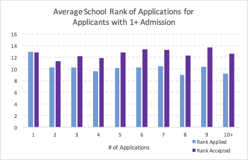 The final graph shows the average school rank of the schools applied to verses the school to which they were admitted. I excluded applicants who did not get into at least one school. It is not shocking that applicants tended to get into lower ranked schools than the average rank of their applications. The big takeaway here is that the gap is much smaller for applicants that submitted 5 or fewer applications. For applicants with 2 to 5 applications, the average school accepted is 2 ranks worse than the average application. For applicants with 6+ applications, the average school accepted is 3.2 ranks worse than the average application. So applying to many schools degrades your chance of being accepted to the most elite MBA programs.